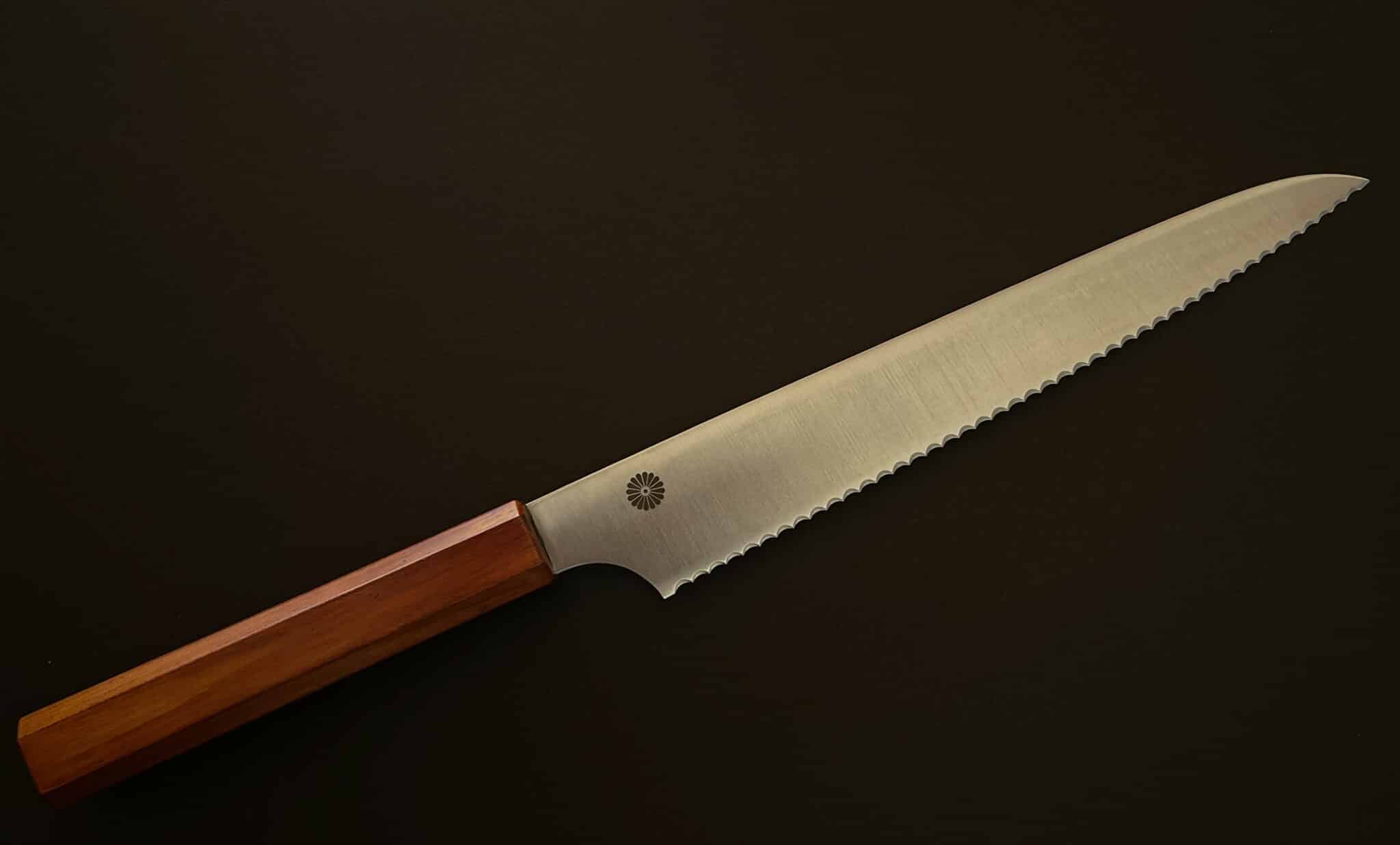 Sharp serrated teeth carved into a 24 cm blade of Hi-chromium stainless steel delivers smooth cutting & long durability. Artisan crafted octagonal wood handles fit perfectly in the hand for comfort and control. KIKUSUMI Bread Knife charms with its warm tones and deep grain wood handles that bring sunshine to everyday life.