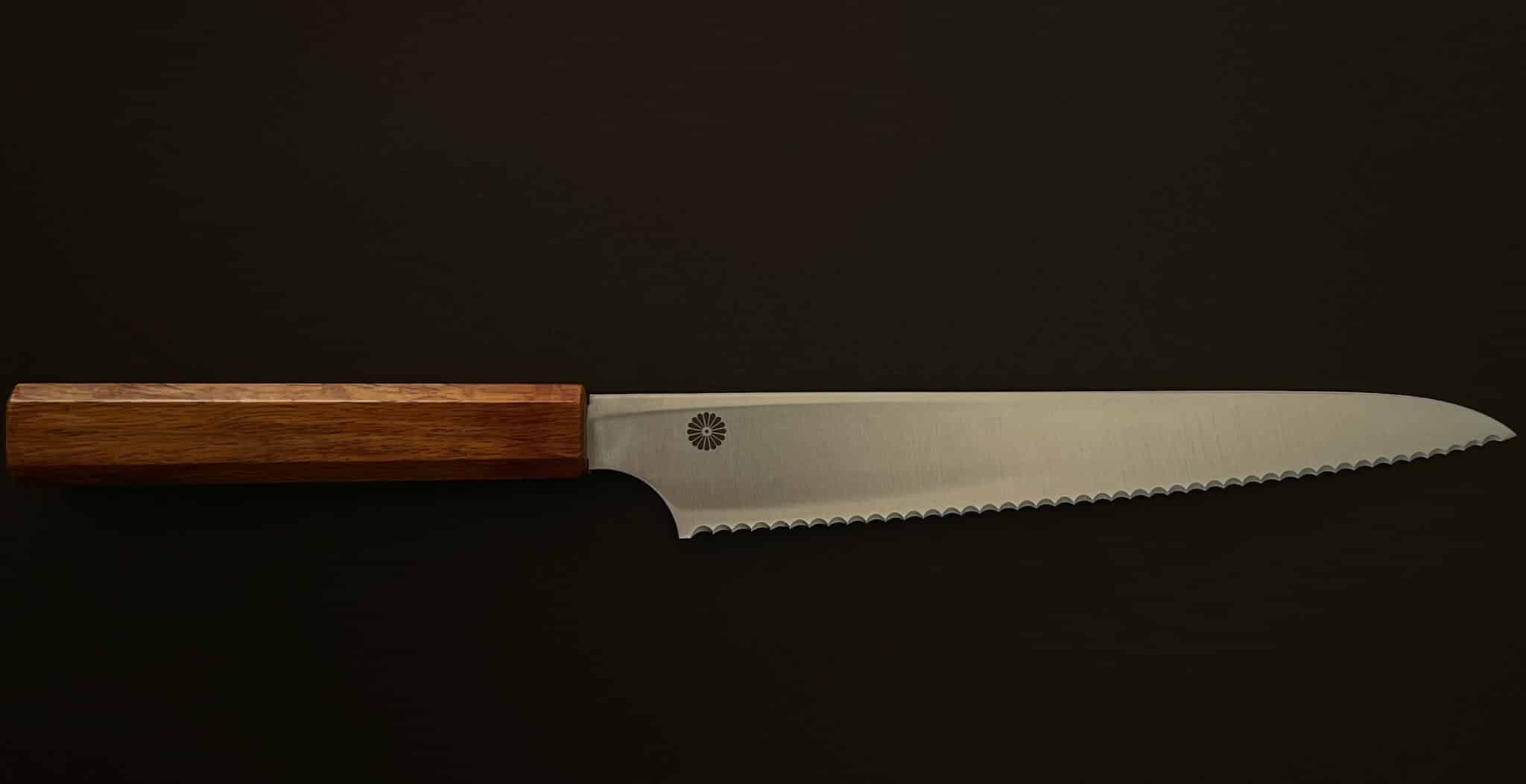 Sharp serrated teeth carved into a 24 cm blade of Hi-chromium stainless steel delivers smooth cutting & long durability. Artisan crafted octagonal wood handles fit perfectly in the hand for comfort and control. KIKUSUMI Bread Knife charms with its warm tones and deep grain wood handles that bring sunshine to everyday life.