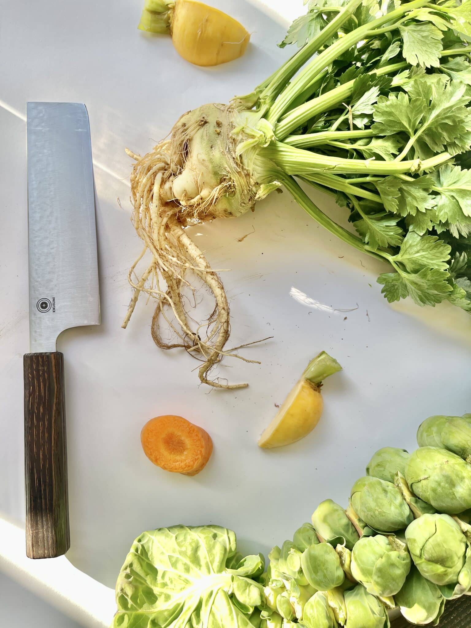 Nakiri knife has a uniquely shaped blade that makes it optimal for preparing vegetables efficiently. The blade is wide from heel to tip so it can process vegetables evenly. Whether pushing the knife downward and forward or using the Japanese katsura peeling motion, the NATUR HOME Nakiri makes cutting easy. A must have in kitchens processing large amounts of vegetables orfruit for smoothies, soups and salads.